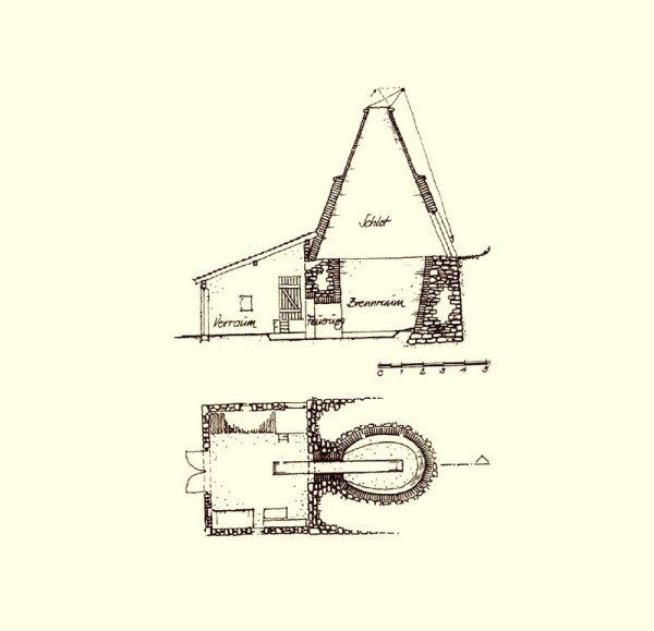 Im Brennraum wurde ein Gewölbe aus Kalksteinen errichtet. Darunter brannte das Feuer, das vom Vorraum aus mit Scheitholz mehrere Tage lang, Tag und Nacht, unterhalten wurde. Die eingefügten hölzernen Pfeifenstangen verbrannten sofort und im so entstandenen Hohlraum konnten die Abgase in den Schlot entweichen. Eine Abdeckung der Steine verteilte die Wärme gleichmäßig auf die ganze Füllung des Brennraumes und ermöglichte die Steuerung des Brennvorganges.